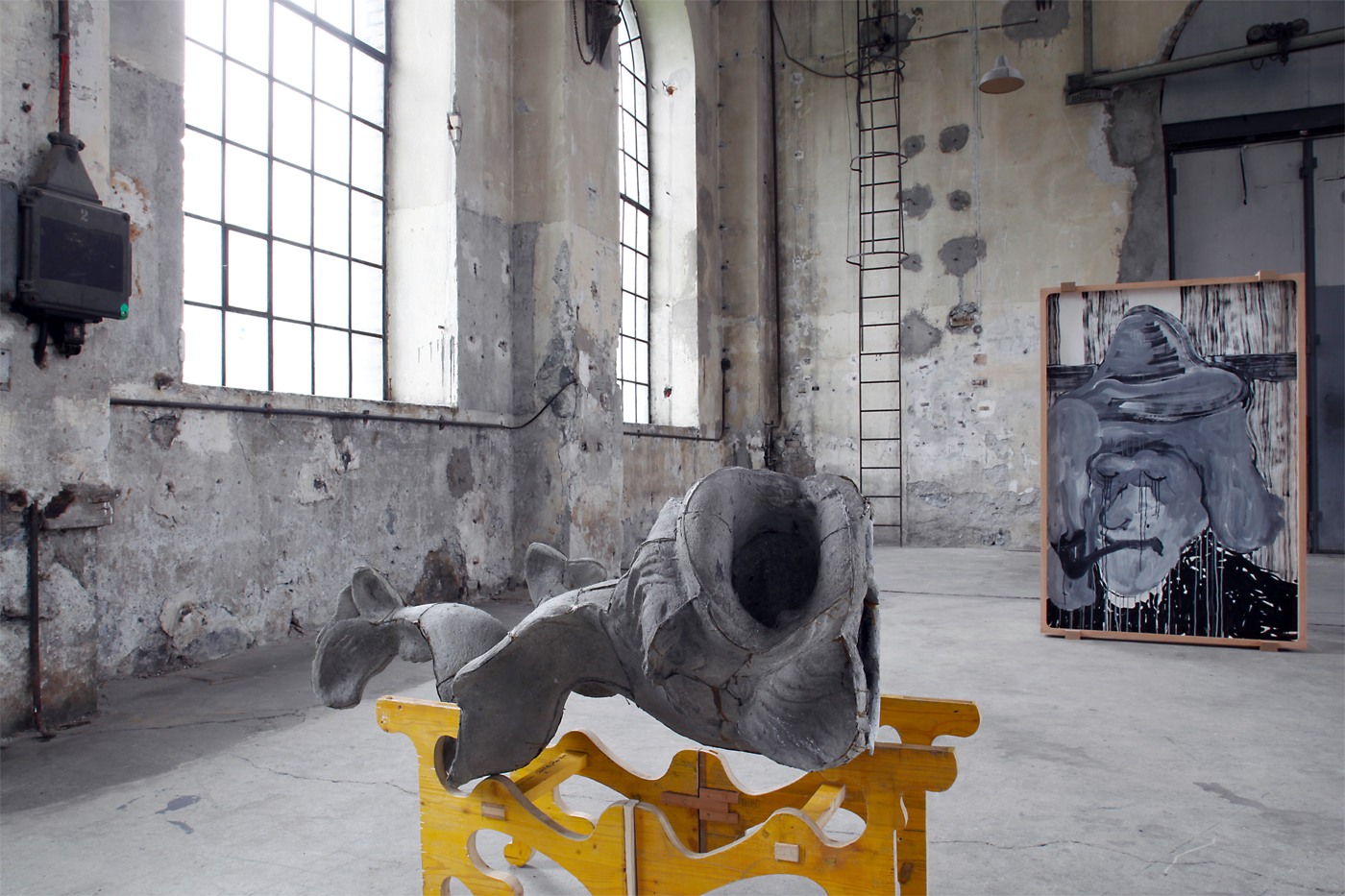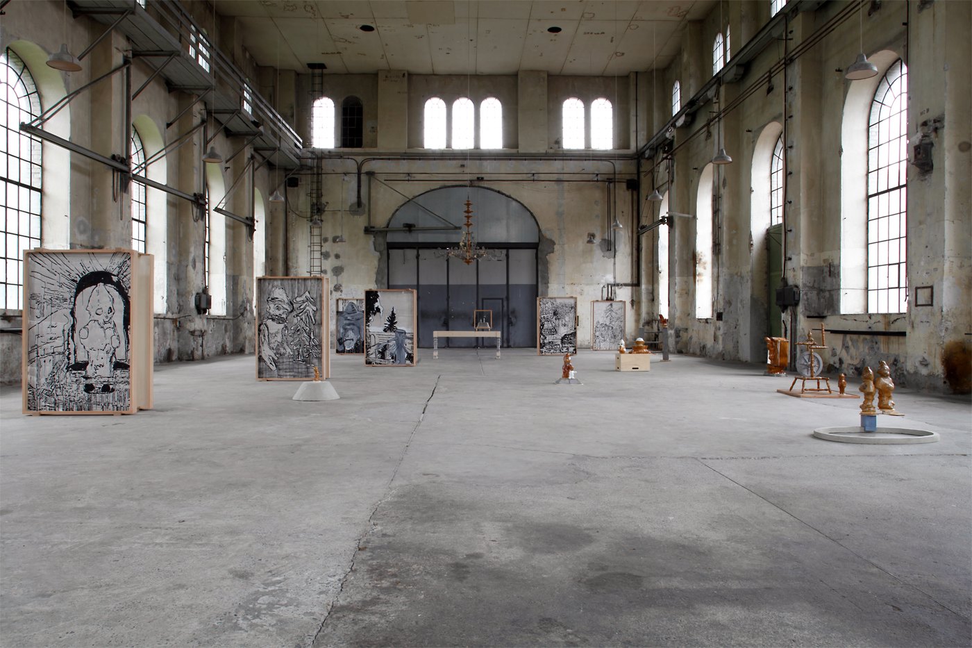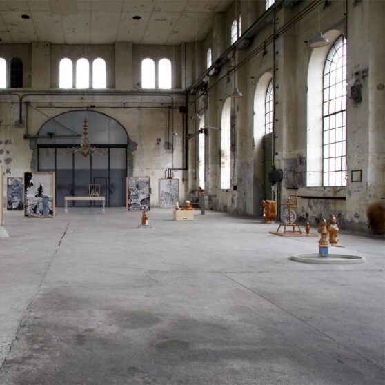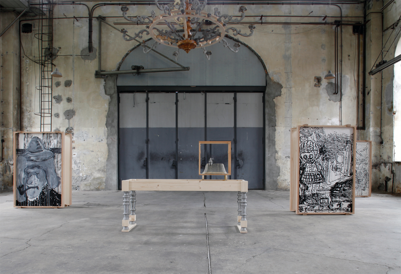 The sacral atmosphere of the assembly hall appealed to us of course from the beginning. The mensa with the chandelier above it reinforced this impression. Christian iconography is incorporated in our work in a very concealed manner. The chandelier stands for a ceremonious occasion, and here, in this historical industrial assembly hall, acts as a surrogate relict.