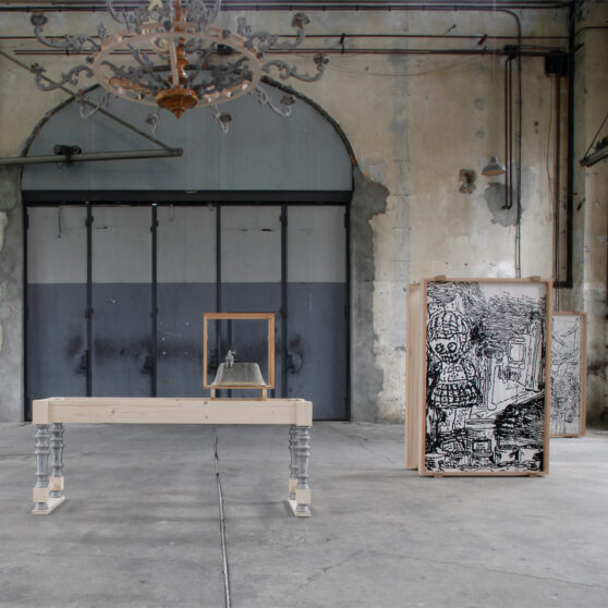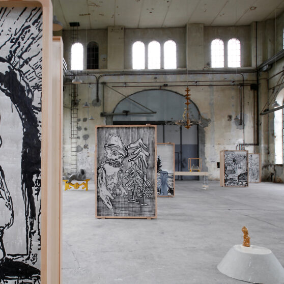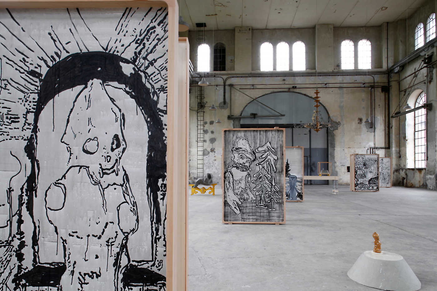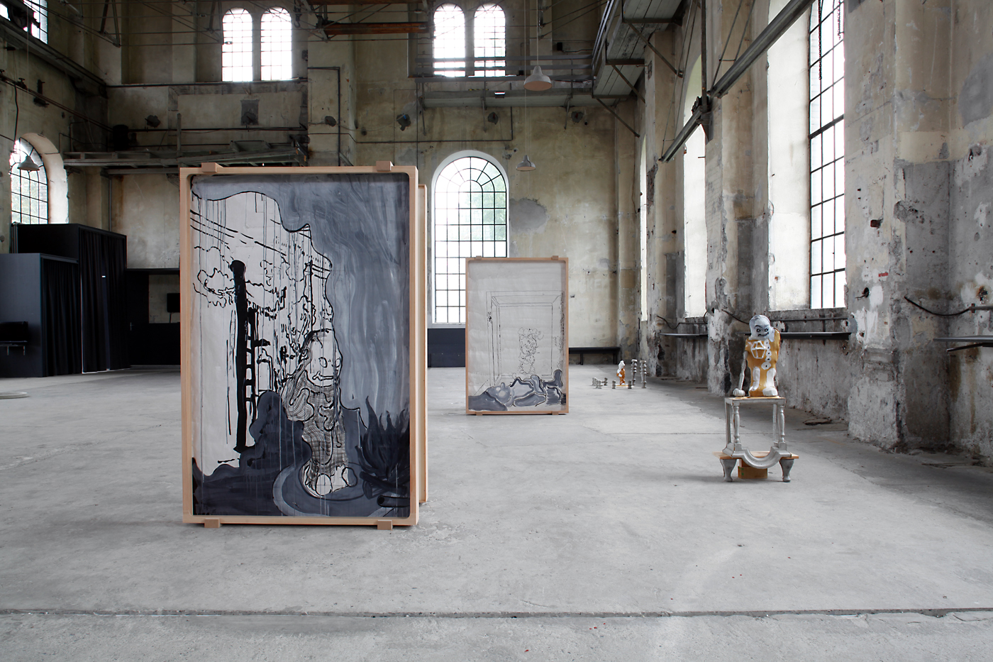 The sacral atmosphere of the assembly hall appealed to us of course from the beginning. The mensa with the chandelier above it reinforced this impression. Christian iconography is incorporated in our work in a very concealed manner. The chandelier stands for a ceremonious occasion, and here, in this historical industrial assembly hall, acts as a surrogate relict.