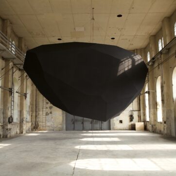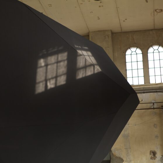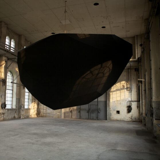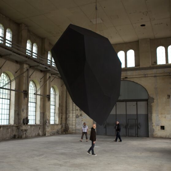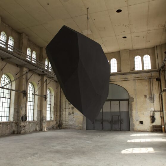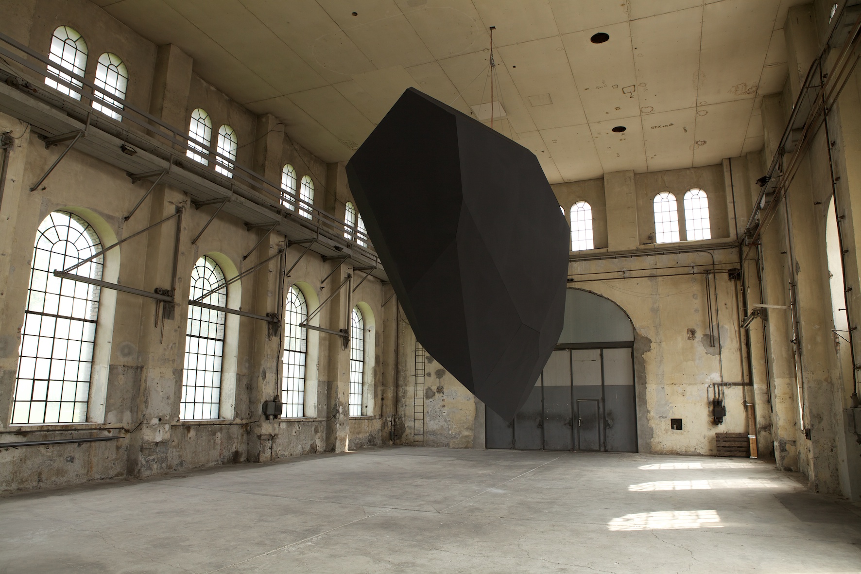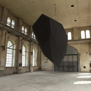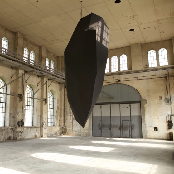 Levitation, Thilo Frank’s exhibition at Kunstraum Dornbirn, does not shy away from such weighty matters. From the ceiling of the former industrial space, Frank has hung an enigmatic, black polyhedron, reminiscent of a bulky, wedge-shaped monolith. Two-stories high and weighing one metric ton, it revolves steadily at eye level, a simple, yet effective gesture that is fundamentally surreal; we know the polyhedron is heavy, but we experience it floating above us in the unsettling zone just above our brains.