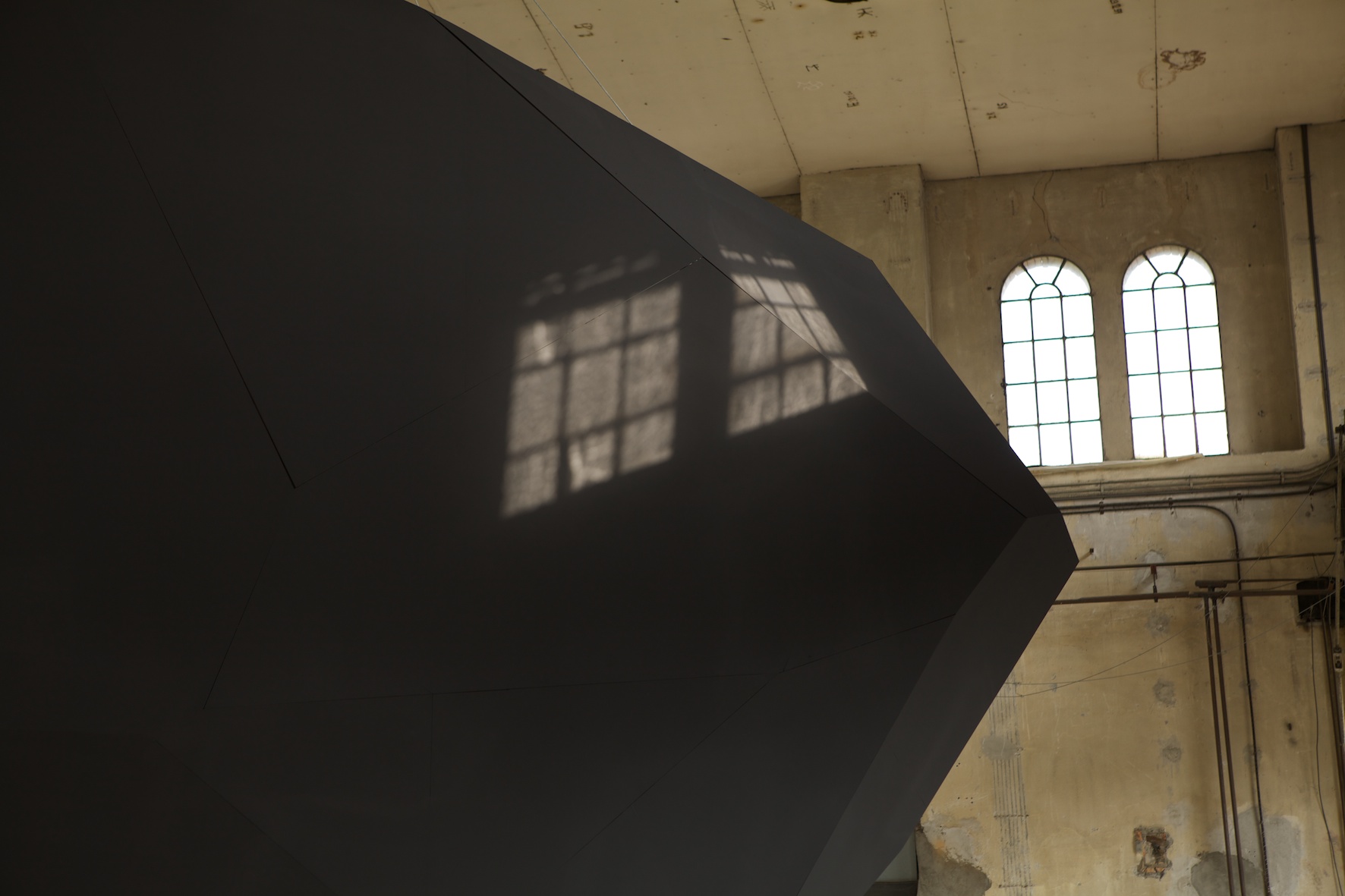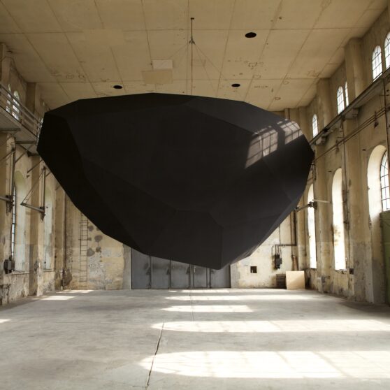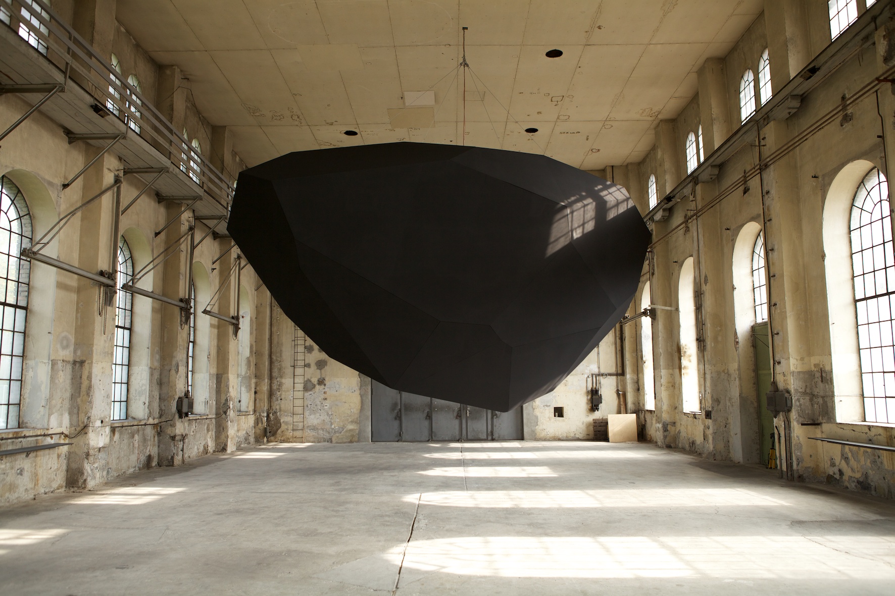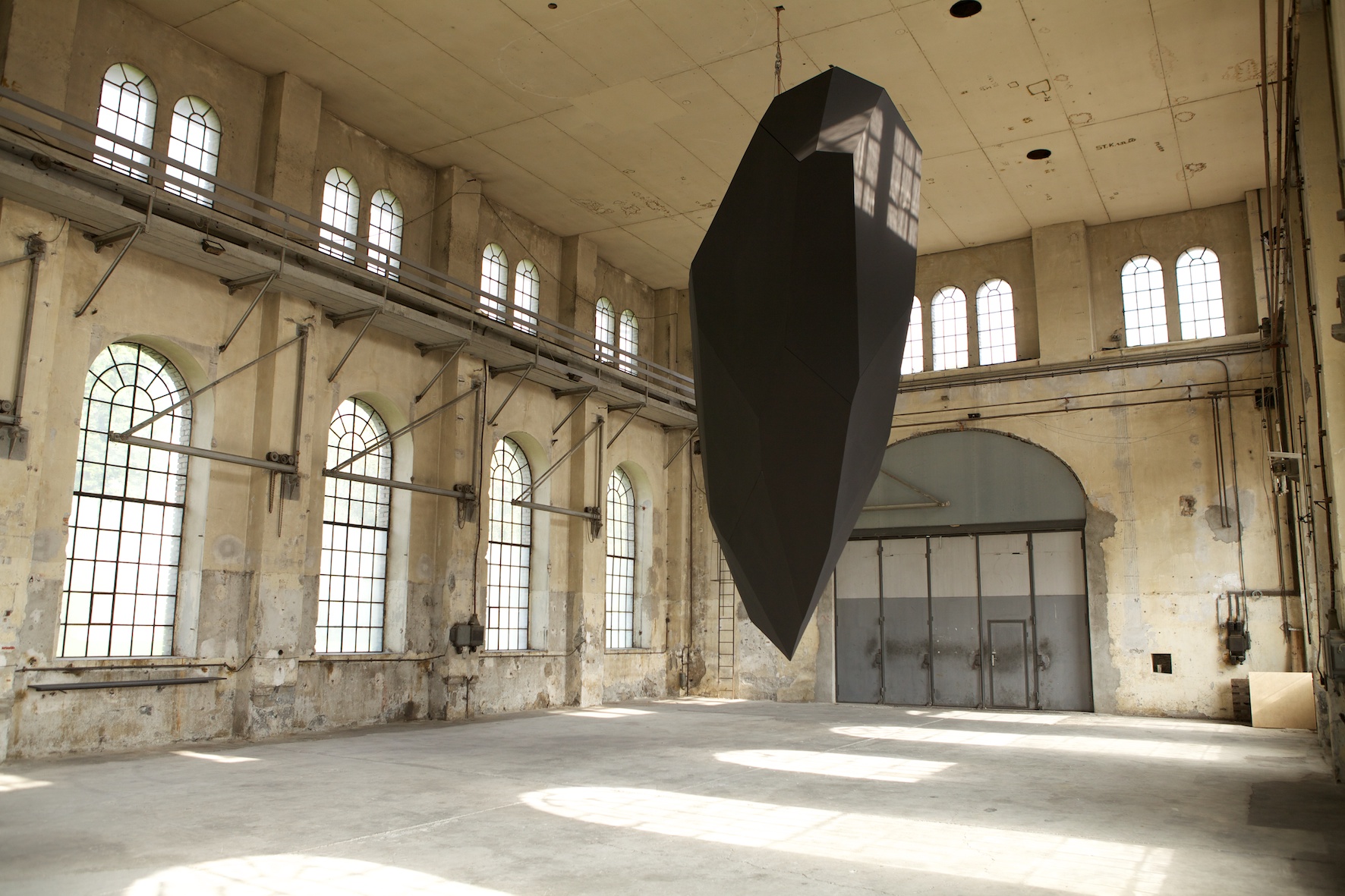 Levitation, Thilo Frank’s exhibition at Kunstraum Dornbirn, does not shy away from such weighty matters. From the ceiling of the former industrial space, Frank has hung an enigmatic, black polyhedron, reminiscent of a bulky, wedge-shaped monolith. Two-stories high and weighing one metric ton, it revolves steadily at eye level, a simple, yet effective gesture that is fundamentally surreal; we know the polyhedron is heavy, but we experience it floating above us in the unsettling zone just above our brains.
